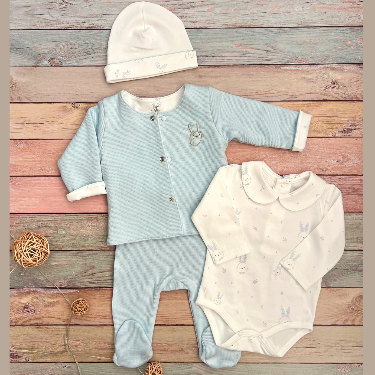 La ilusión de su primera ropita, esa que nos quedará grabada en el corazón por siempre. Set de primera puesta de 4 piezas ideales para su primer cambio. Está elaborado en un mix perfecto de tejido Inglés (chaqueta y pantalón) y gamuza pima (body y gorro).