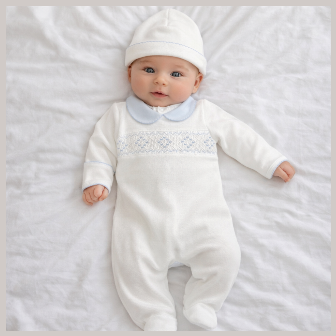 Enterizo Primer Día Bebé Algodón Pima Nido Abeja Blanco/Celeste